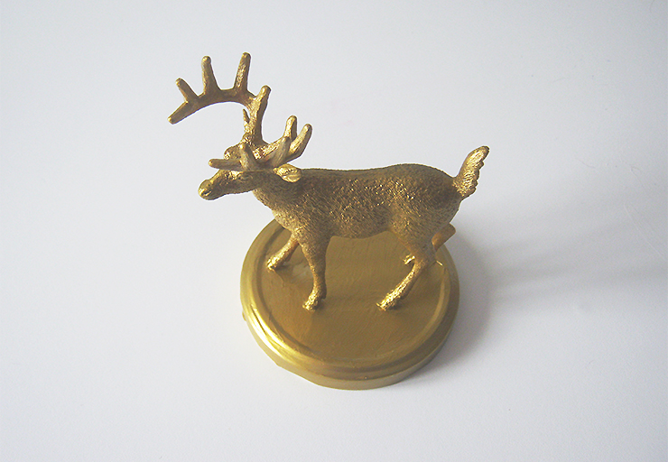 Une fois le bocal vidé, parfaitement nettoyé et séché, collez la figurine animalière sur le couvercle. J’ai mis un gros point de colle sous chaque patte avant d’appuyer fermement.